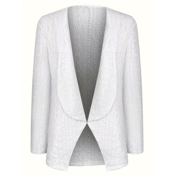 Solid Eyelet Open Front Blazer, Casual Lapel Long Sleeve Outwear For Spring & Fall, Women's Clothing Solid Eyelet Open Front Blazer, Casual Lapel Long Sleeve Outwear For Spring & Fall, Women's Clothing
