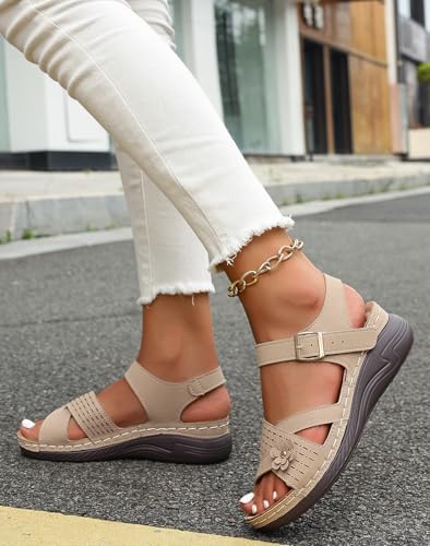 Women's Low Wedge Heels Summer Comfortable Dressy Platform Sandals Buckle Ankle Strap Open Toe Flower Wedge Sandals